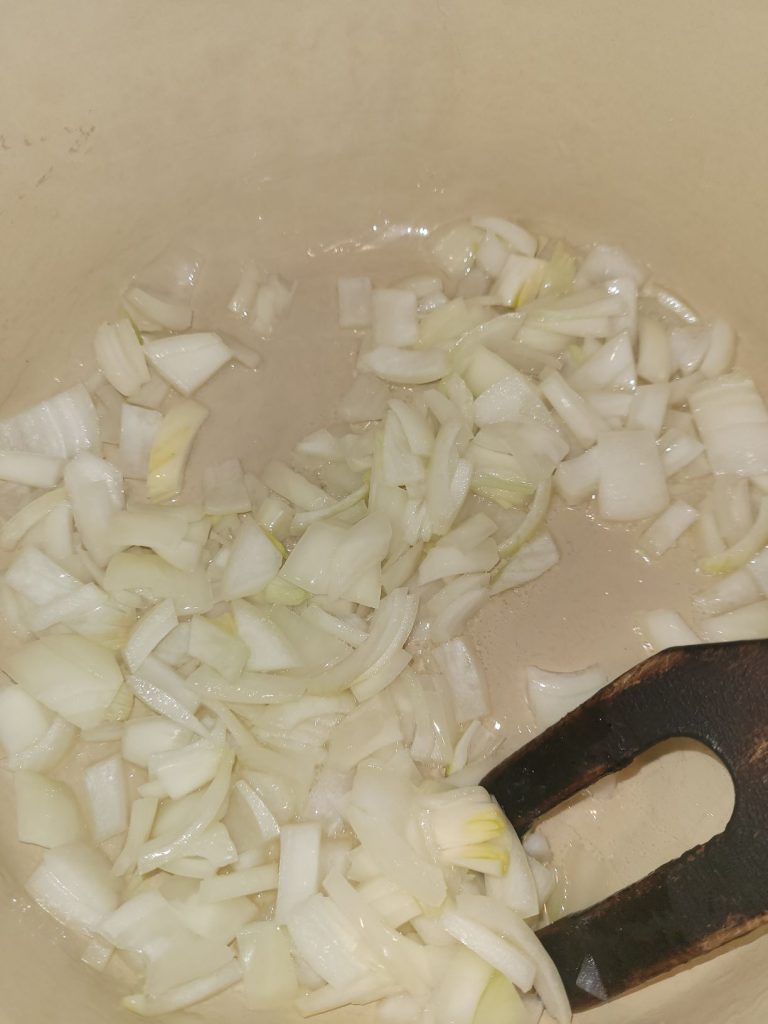 Eg likar å ta vekk den grovaste stilken før eg deler opp blada. Dei grove stilkane finhakkar eg før eg har dei i gryta. Skjer opp blada i passelege bitar. Finhakk løken.