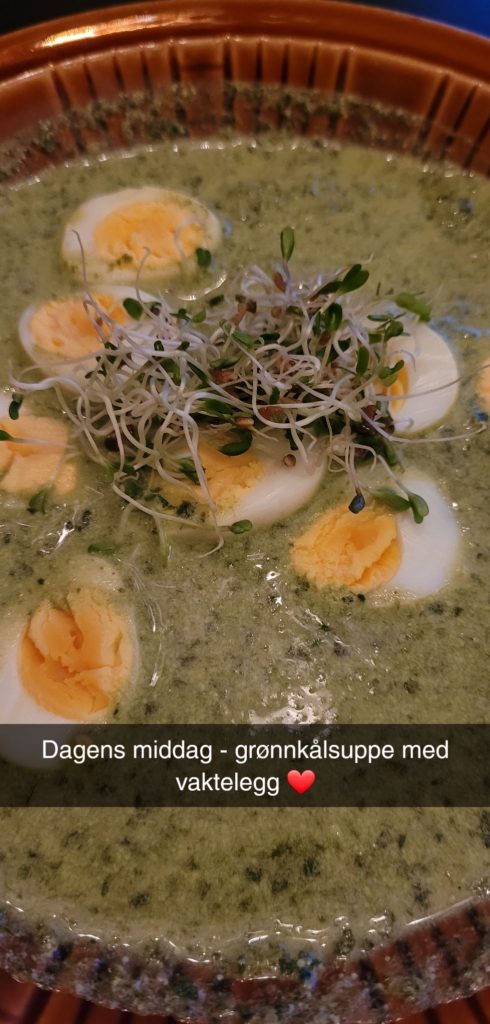 Grønkålsuppe er ein fantastisk god og i tillegg supersunn suppe. Og med vaktelegg i, vert den ei rein delikatesse. I tillegg er grønkål og svartkål, i tillegg til fleire andre kålplanter, noko ein kan ha tilgang på heile vinteren når ein først har planta det. Den toler fint kuldegrader, og har friske nye skot heile vinteren. I tillegg er grønkål ein fleirårig plante, som ber frø andre året. Så har du først planta det, og let den stå til neste sommar, er du sjølvforsynt med grønkål og frø framover. Og så er det så utruleg kjekt å kunne plukke friske grønnsaker til middagen midt på vinteren!